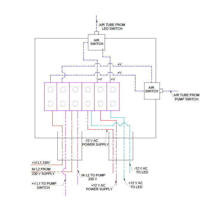The pump’s live (hot) cable will then be split and connected to either side of the air switch. When the actuator (button) is pressed, the circuit is made and the jet will turn on. When it is pressed again, it will disconnect the circuit and stop the pump.